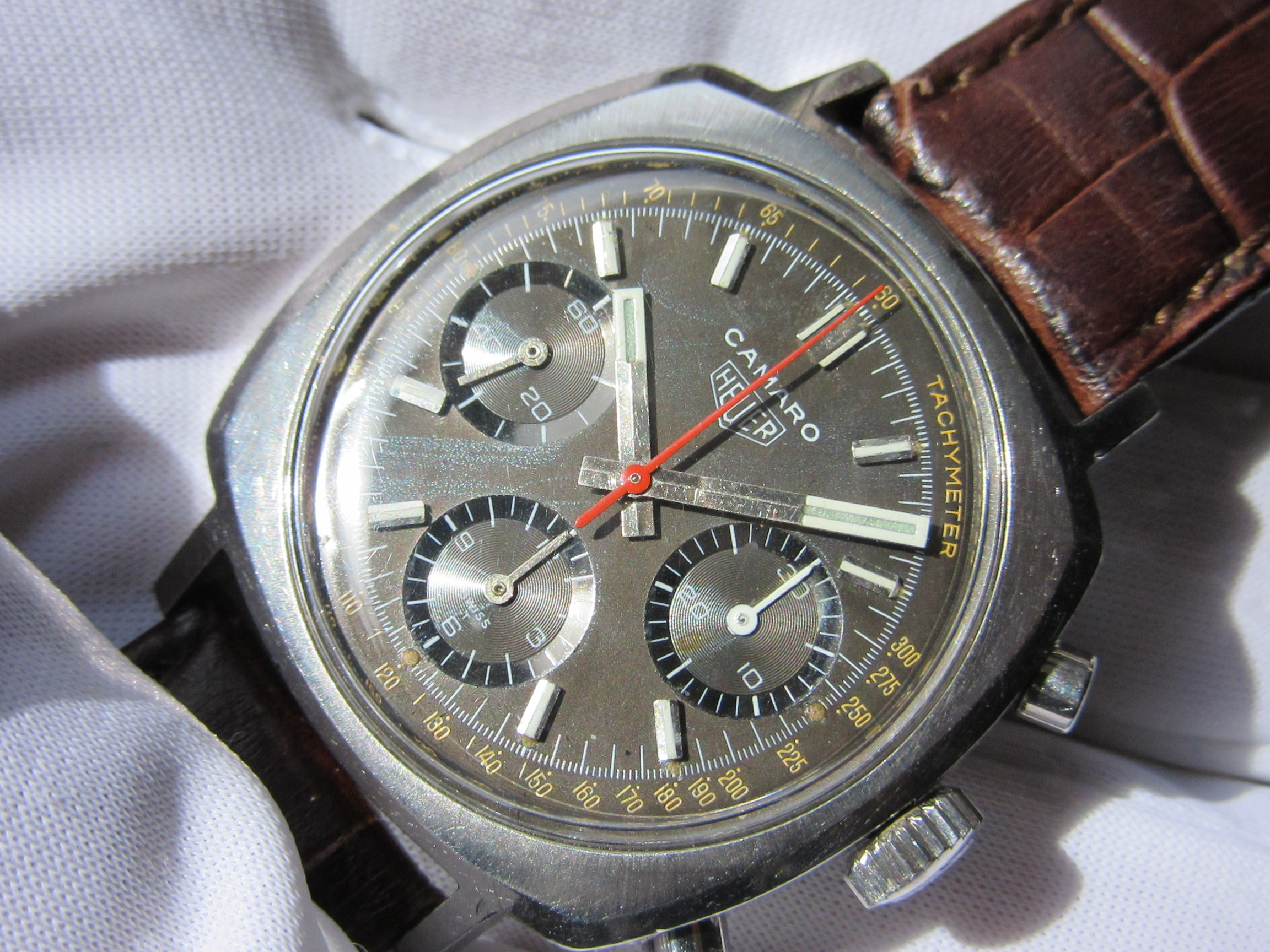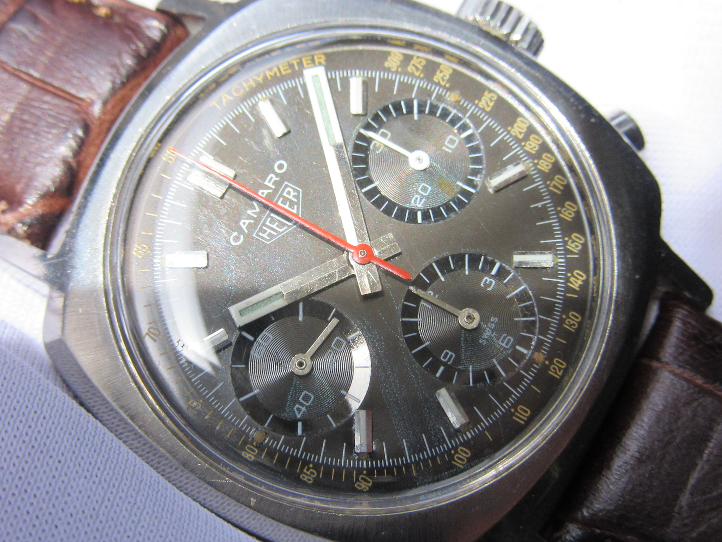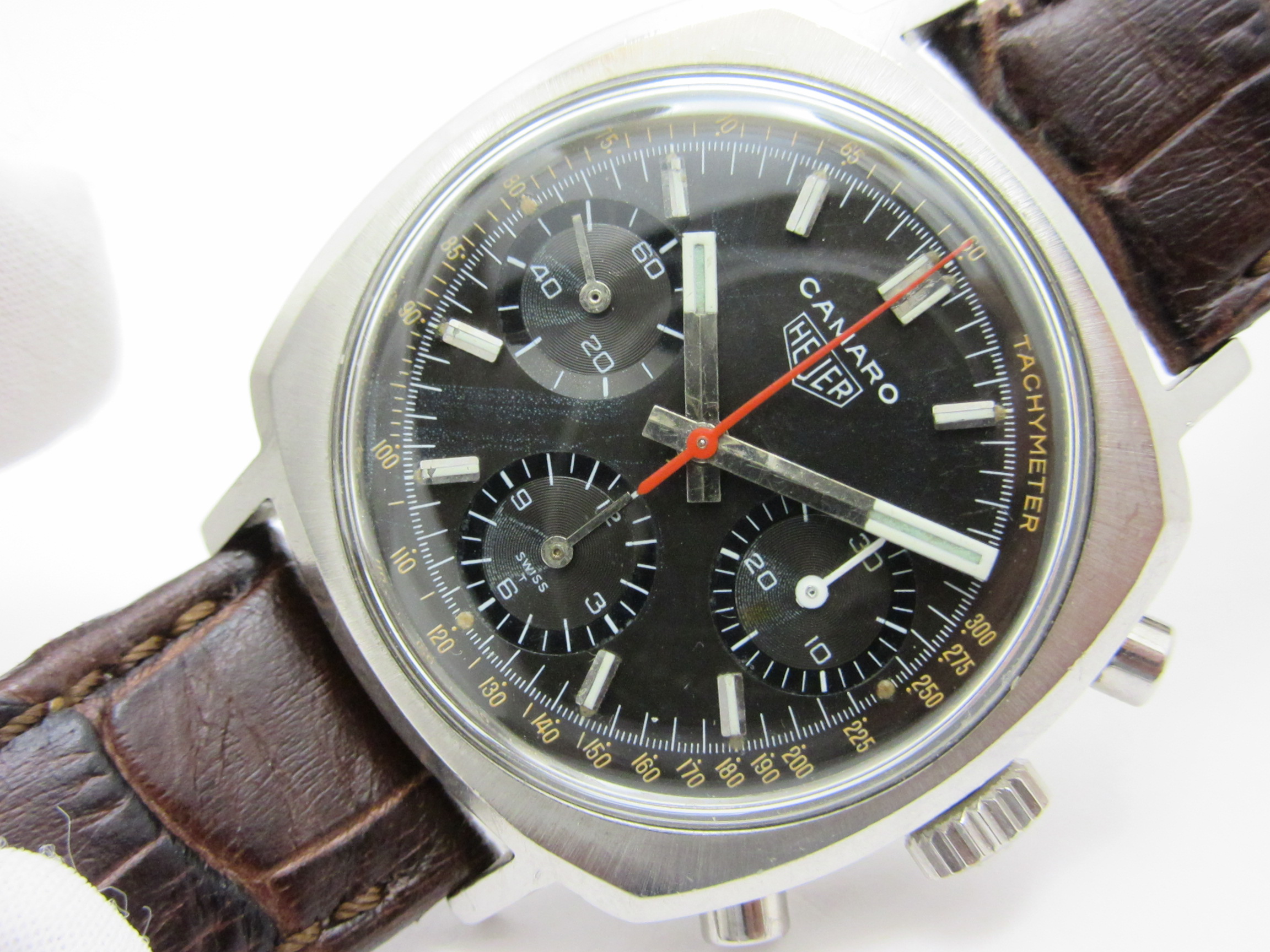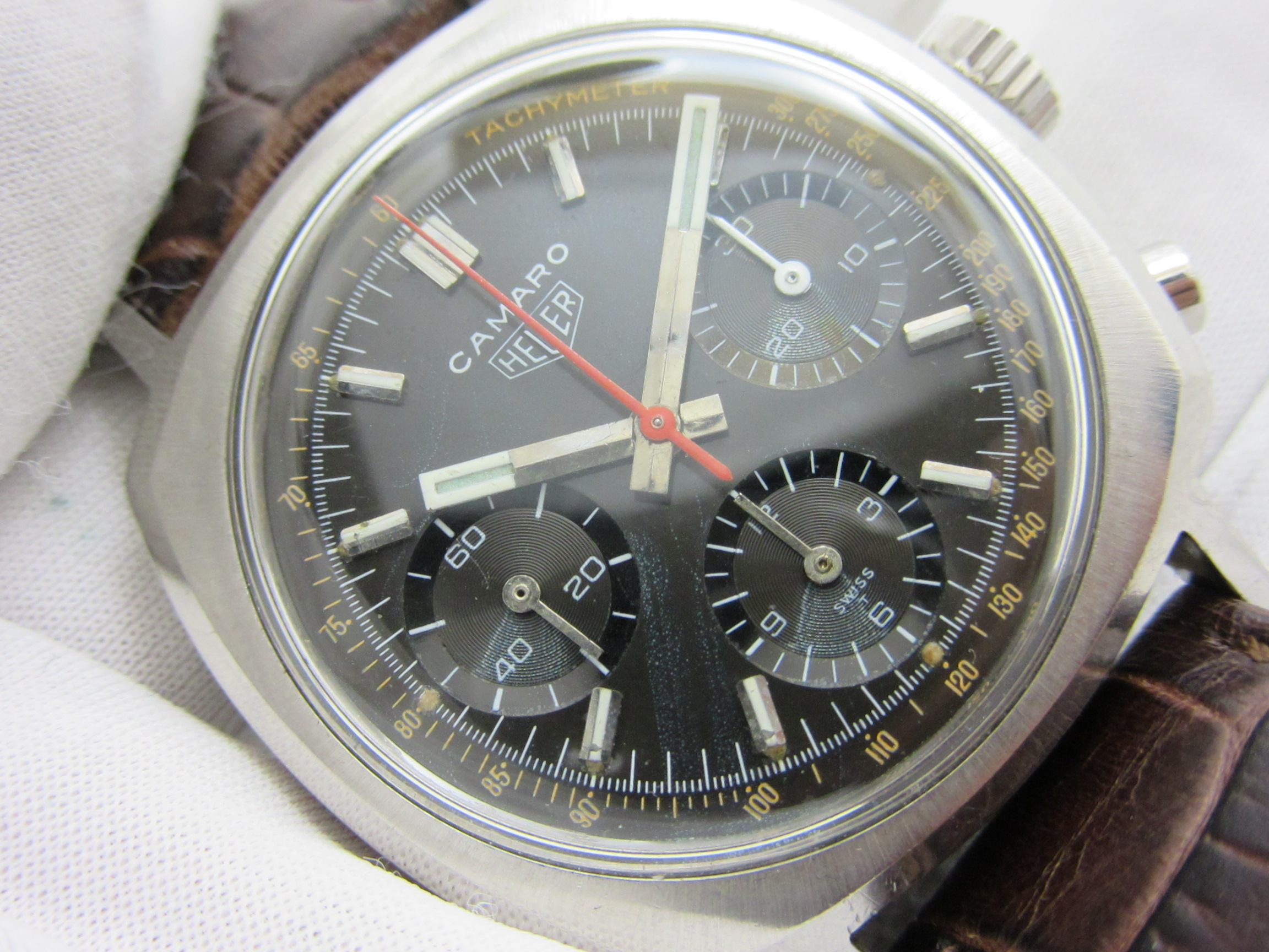 黒文字盤は、紫外線で若干ブラウンに変化した「Tropical Dial 」と呼ばれる状態など、オールド・ホイヤーならではの雰囲気が味わえます。