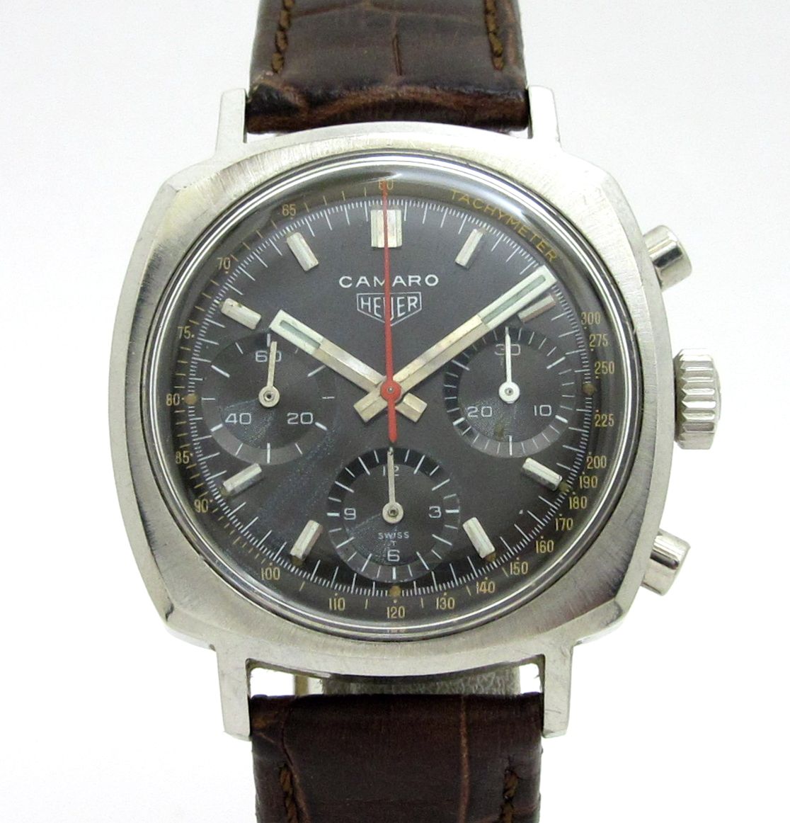 文字盤はブラックマットダイアルです。カマロの生産期間は1968年から1972年ですが、モノクロカラーで構成されたものは1960年代、